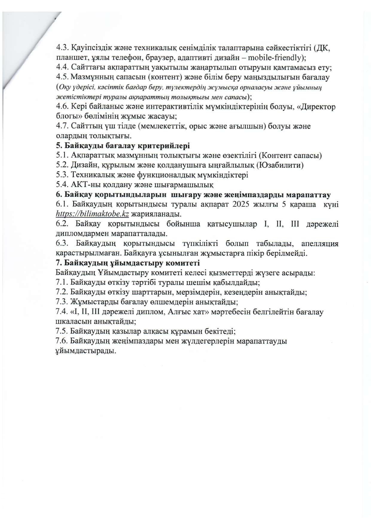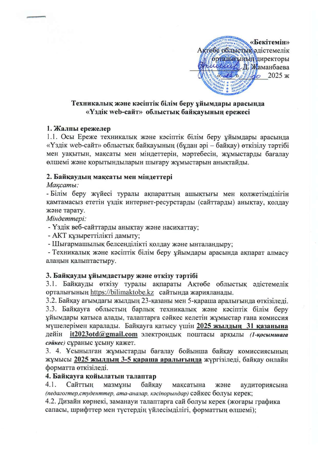 Техникалық және кәсіптік білім беру ұйымдары арасында "Үздік web-сайт" облыстық байқауының ережесі