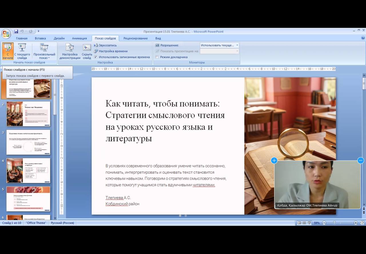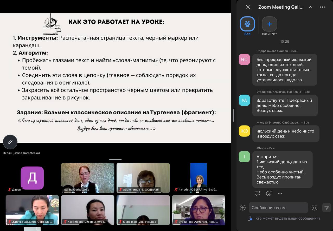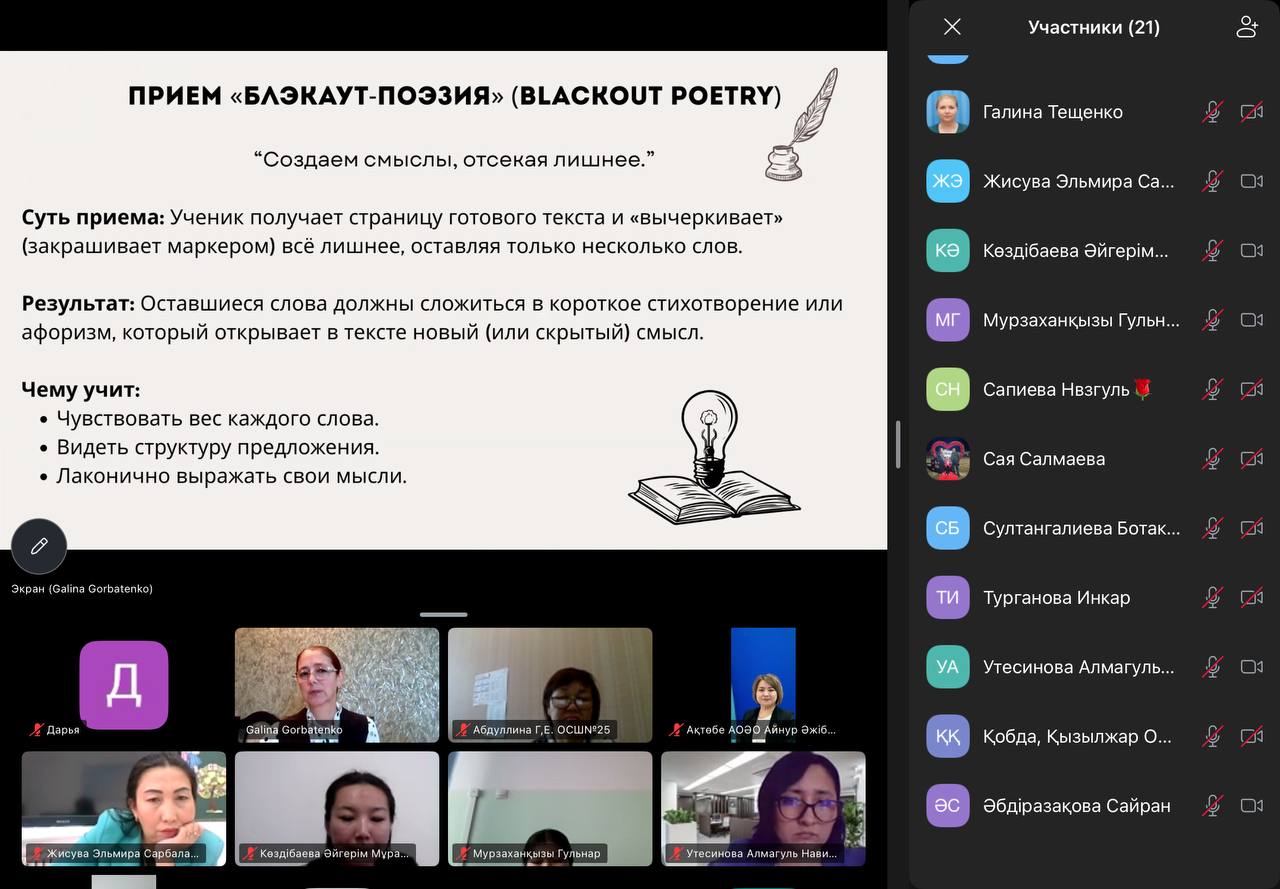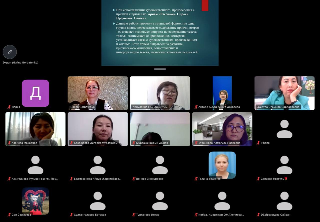 Іс-шара Zoom платформасында, яғни онлайн форматта Ақтөбе қаласындағы «Қызылжар орта мектебі» КММ-нің орыс тілі мен әдебиеті пәнінің мұғалімі, педагог-зерттеуші Горбатенко Галина Петровнаның жетекшілігімен өтті. Қашықтан ұйымдастырылуына қарамастан, кездесу мазмұнды кәсіби диалогқа ұласып, тәжірибе алмасу аясын кеңейтуге мүмкіндік берді.