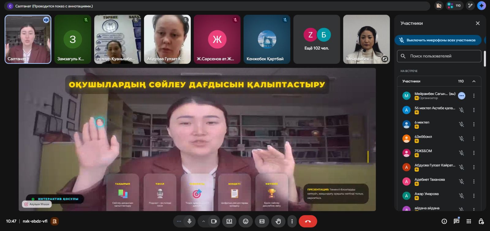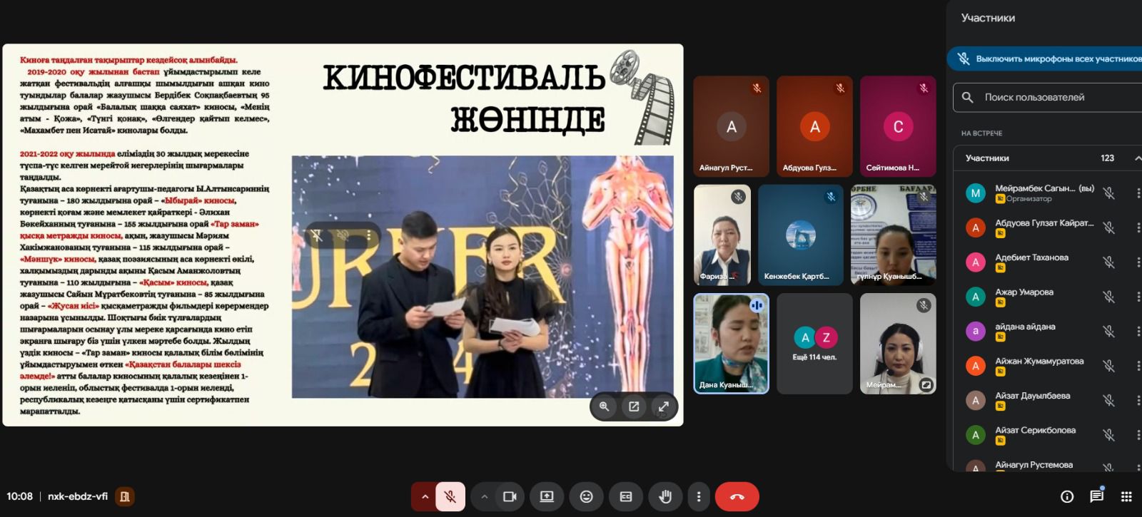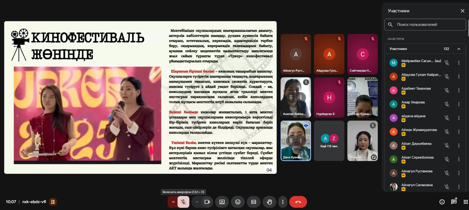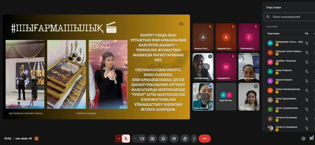 - Қуанышбекова Дана Тынықбайқызы «Үркер кинофестивалі: тәрбие мен шығармашылықты ұштастыру тәжірибесі» тақырыбында тәжірибесімен бөлісті;