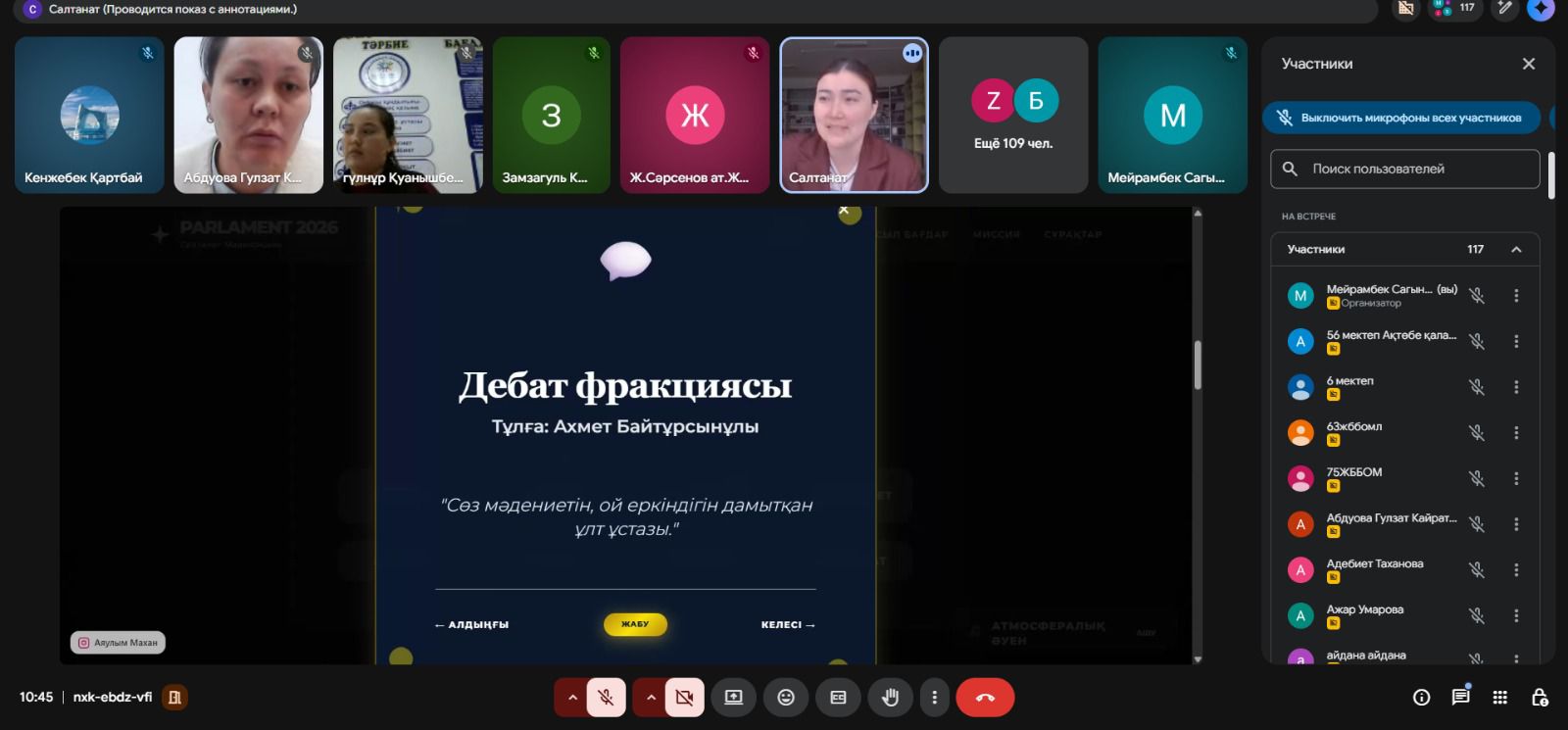 - Мадиярқызы Салтанат «Ұлттық рухтан – көшбасшылыққа» бағытындағы жұмысын ұсынды;