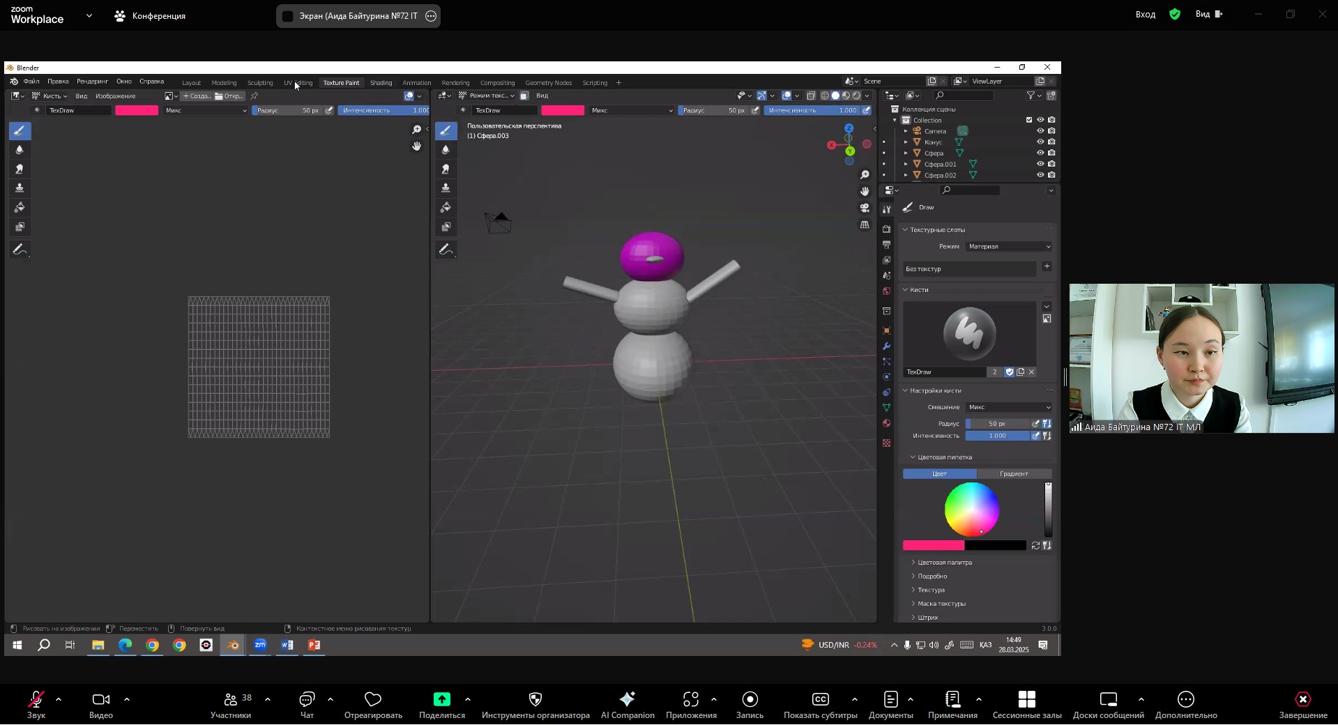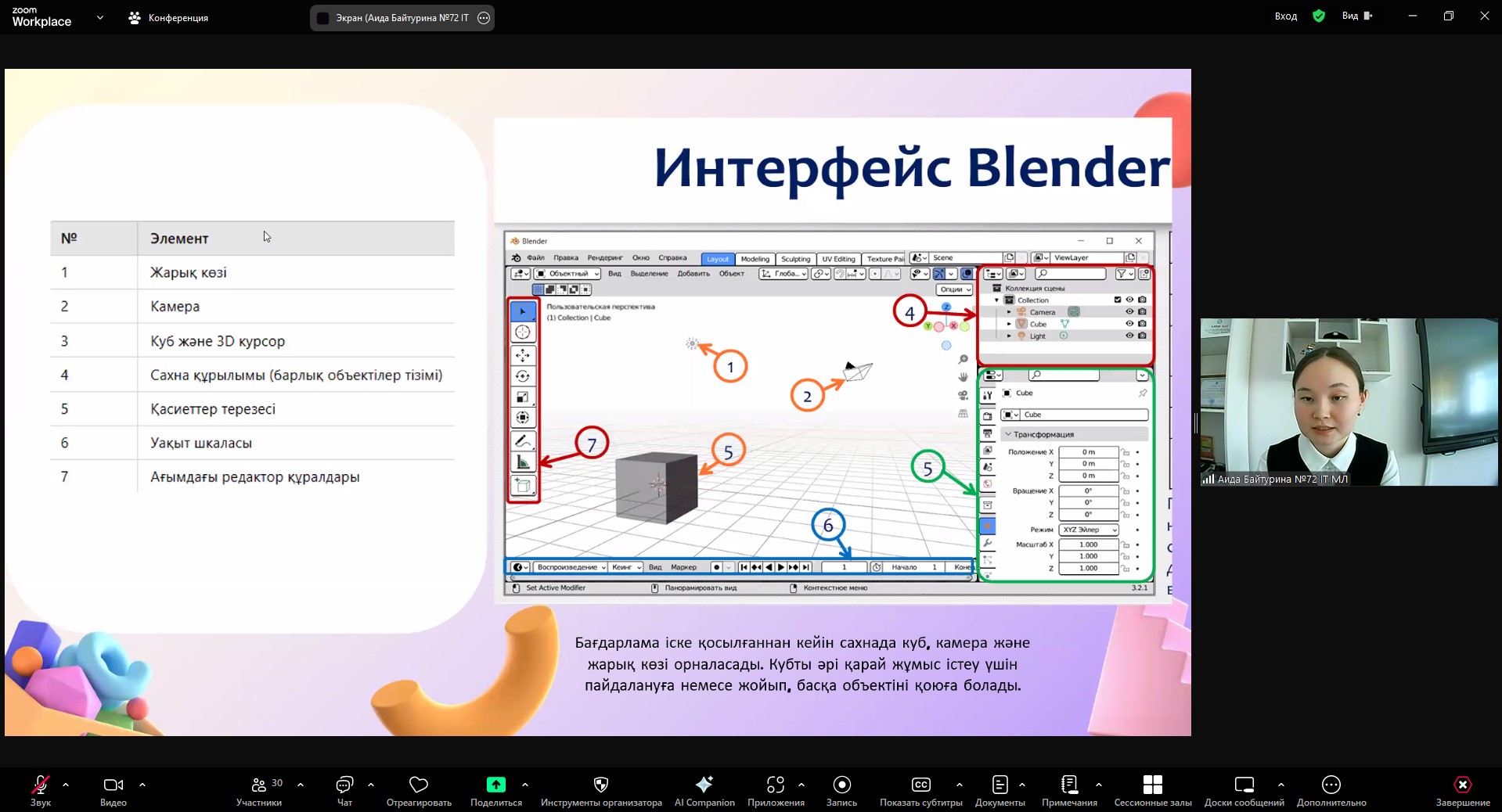 Семинар барысында Ақтөбе қаласының Ә.Кекілбайұлы атындағы №72 ІТ мектеп-лицейінің информатика пәні мұғалімі, п.ғ.м «Blender бағдарламасында 3D модельдеу: қадамдап үйрену» туралы базалық дағдыларын қалыптастыру мақсатында Blender интерфейсі, негізгі құралдар, модель құрастыру әдістері және объектілермен жұмыс істеу процестері кезең-кезеңімен түсіндіріп берді.