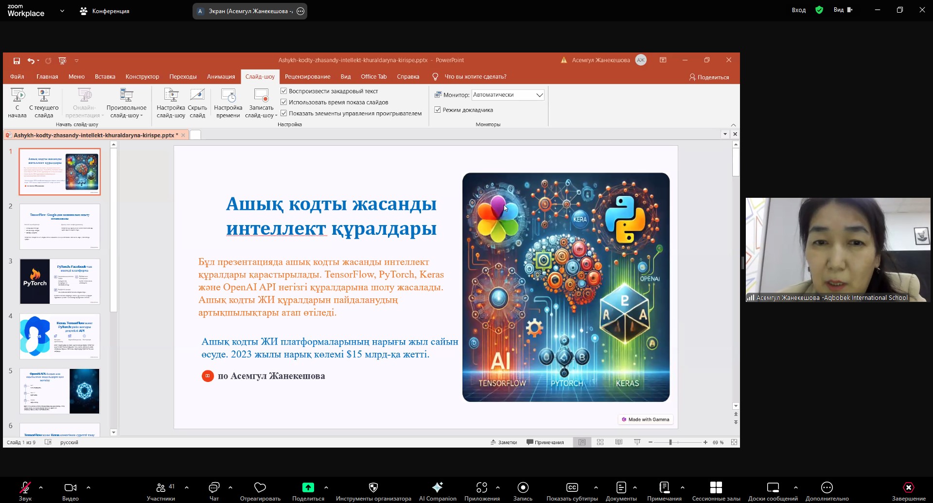 Қазіргі таңда ашық кодты жасанды интеллект платформалары мен кітапханалар AI жобаларын әзірлеуде басты құралдардың біріне айналды. «Ашық кодты жасанды интеллект құралдары» (TensorFlow, PyTorch, Keras, OpenAI API) бойынша Aqbobek International School мектебінің информатика пәні мұғалімі Жанекешова Асемгул Андреевна нейрондық желілерді құруға арналған ең танымал және қолжетімді құралдармен таныстырды.