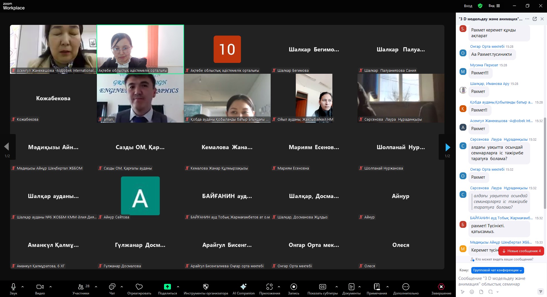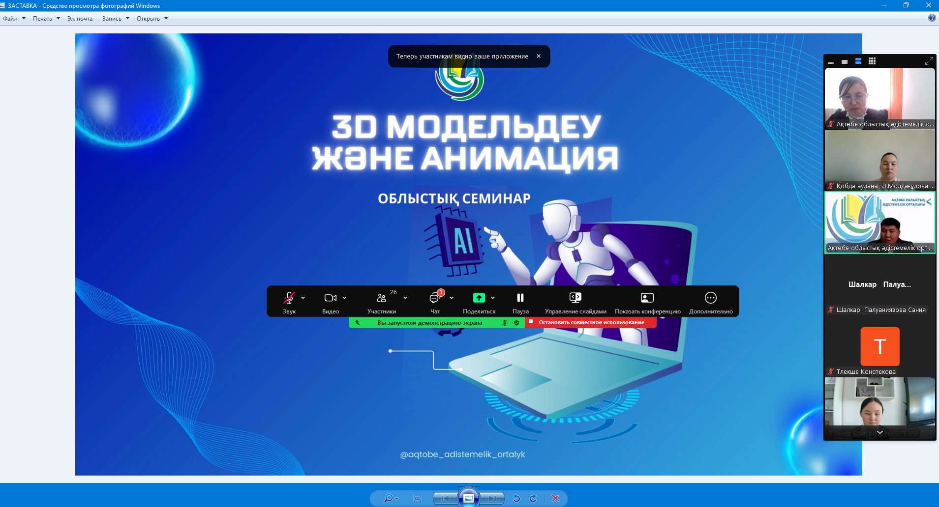 Ағымдағы жылдың 28 наурыз күні Ақтөбе облыстық әдістемелік орталығының жылдық жоспарына сәйкес «3 D модельдеу және анимация» атты облыстық семинар өтті. Онлайн тәртібінде өткен семинарға 30-ға жуық информатика пәні мұғалімдері қатысты. Бұл семинар қатысушылардың цифрлық модельдеу саласындағы білімін арттыру мақсатында ұйымдастырылды.  Орталықтың бөлім  меңгерушісі Жаншуақ Нұрлыбайұлы 3D модельдеу ұғымы, оның техникалық мүмкіндіктері, бағдарламалық құралдары және практикалық қолдану жолдары бойынша жан-жақты түсіндірді.