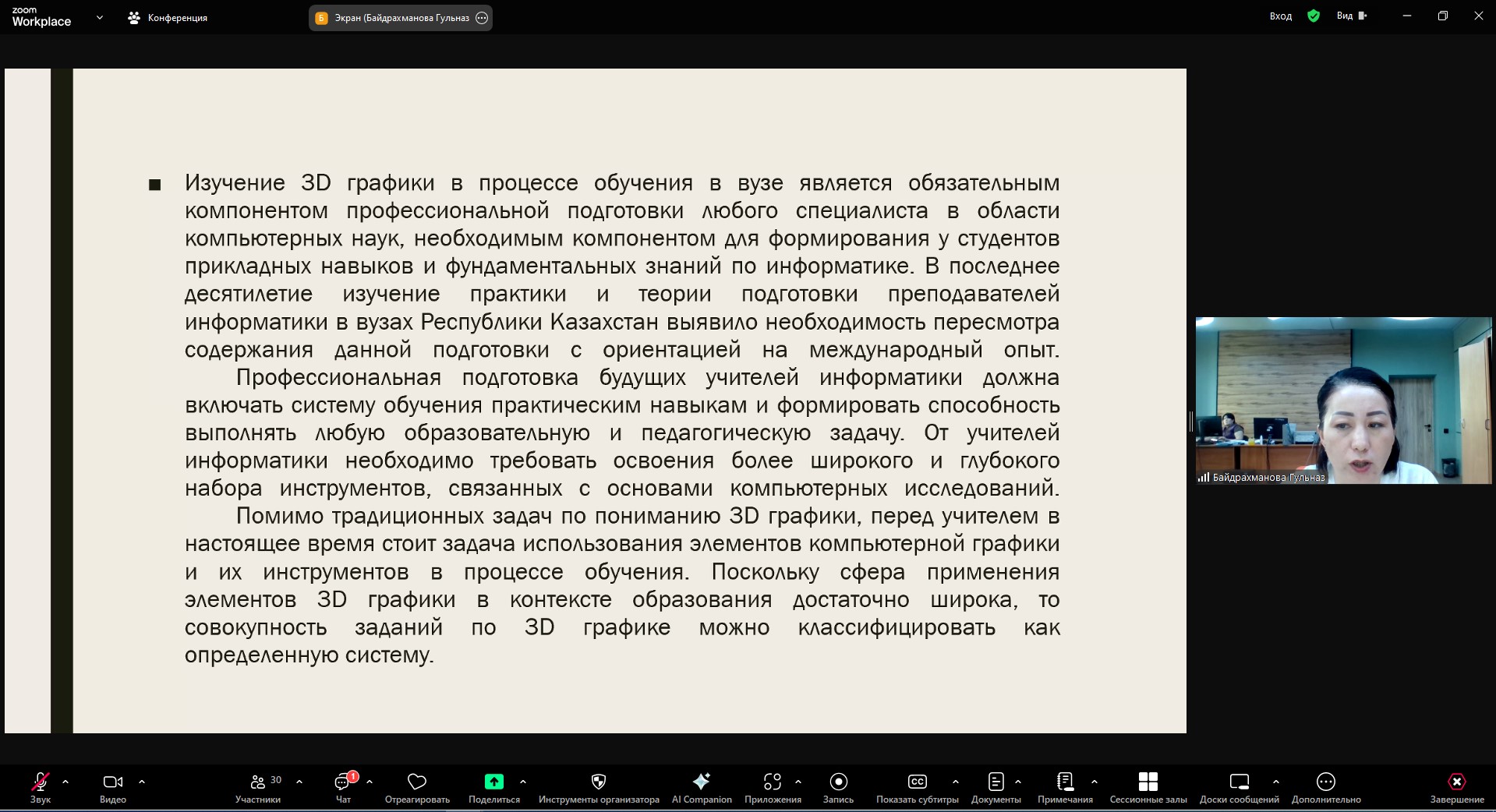 Семинар бағдарламасына сәйкес Қ.Жұбанов атындағы Ақтөбе өңірлік мемлекеттік университетінің аға оқытушысы, PhD докторы Байдрахманова Гульназ Абилбахитовна қазіргі білім беру жүйесінде болашақ информатика мұғалімдерін даярлауда 3D-графика элементтерін қолдану,  3D-графика бойынша тапсырмалар жүйесі мұғалімнің теориялық білімін тереңдетуге, кеңістіктік ойлауын дамытуға және кәсіби цифрлық құзыреттерін қалыптастыру бойынша өз тәжірибелерімен бөлісіп, теориялық және практикалық жұмыстарын көрсетті.