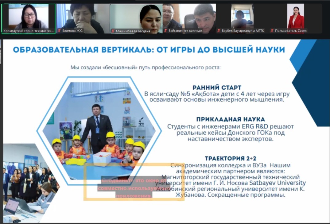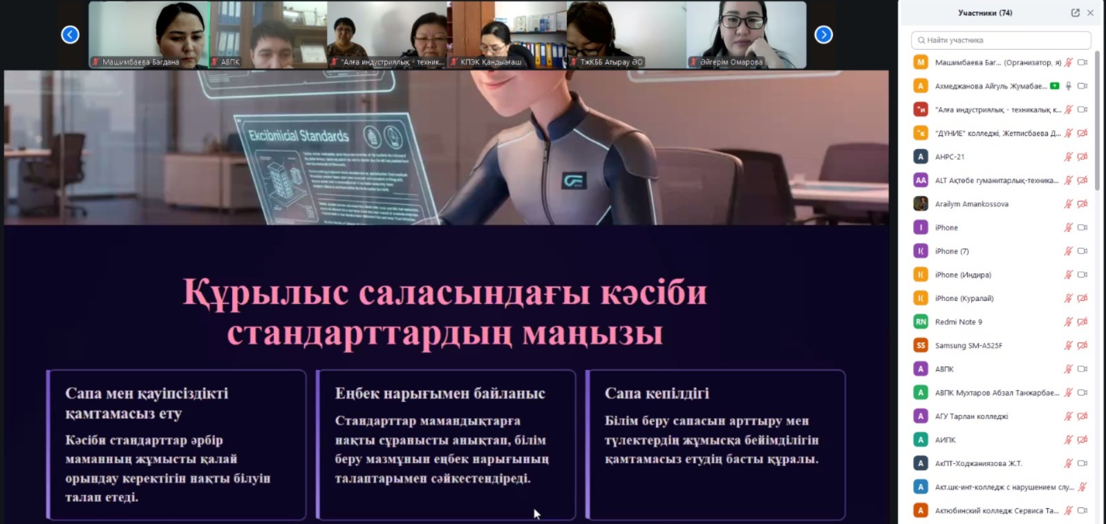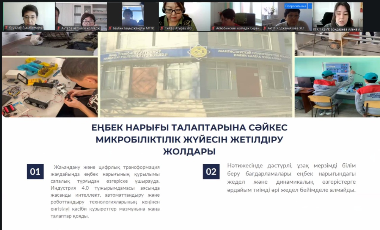 В ходе мероприятия заместитель директора по IT Хромтауского горно-технического высшего колледжа Г. Изтаева представила опыт реализации регионального кластера «Profi-Start» – синхронизированной системы от ранней профориентации до целевого трудоустройства. Заместитель директора по учебно-методической работе Карагандинского технико-строительного колледжа, тренер НАО «Talap» К. Жуманбаева и заведующая отделением, преподаватель специальных дисциплин А. Бондарева поделились опытом разработки образовательных программ для обучающихся с особыми образовательными потребностями в условиях инклюзивного ТиПО. Заведующая учебным отделом Атырауского колледжа энергетики и строительства А.Ахмеджанова представила практику разработки образовательных программ на основе обновлённых профессиональных стандартов, обозначив возникающие трудности и пути их решения. Заместитель директора по учебной работе Мангистауского высшего политехнического колледжа имени Х. Узбекгалиева Г. Юбасарова осветила вопросы совершенствования системы микроквалификаций в соответствии с требованиями рынка труда. Кроме того, заместитель директора по учебной работе Актюбинского высшего политехнического колледжа Е.Утеулиев представил направления трансформации содержания ТиПО на основе опыта колледжа, прошедшего международную аккредитацию.