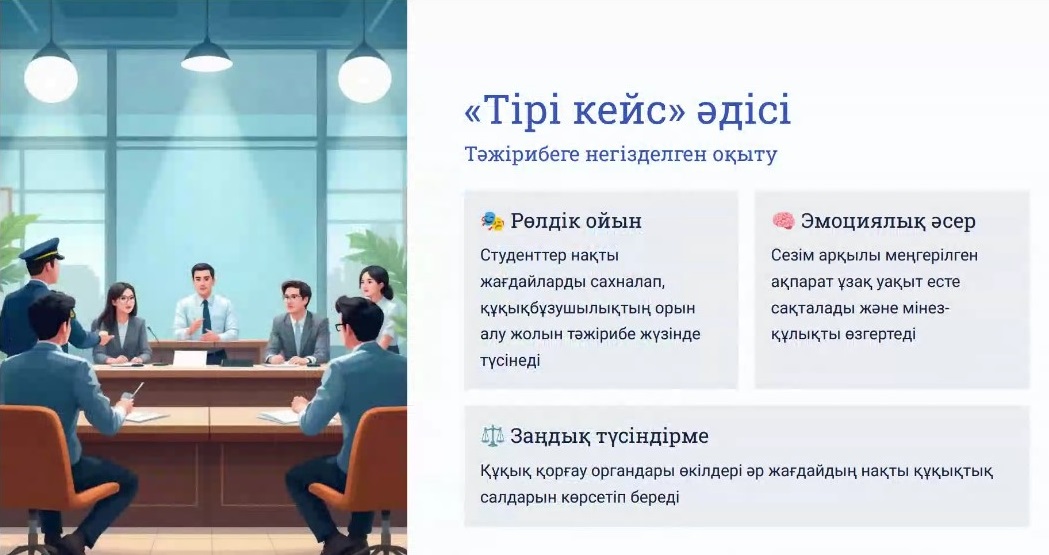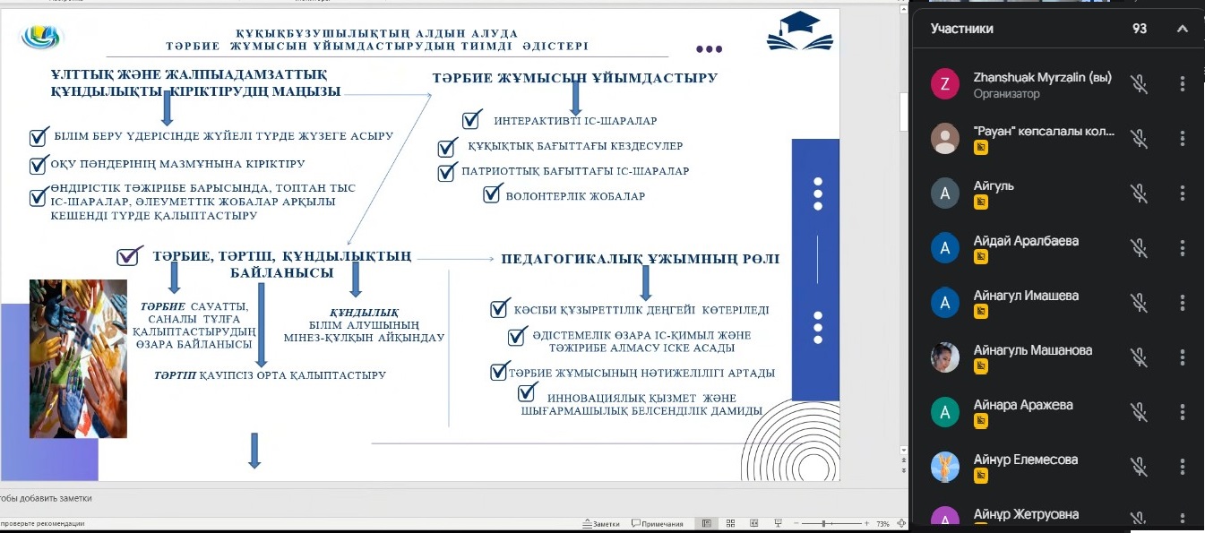 - Заместитель директора по воспитательной работе Чингирлауского колледжа Западно-Казахстанской области Э.Багиджанова представила методику «Тәртіп пен тәрбие», акцентировав внимание на неразрывной связи дисциплинарного контроля и воспитательных мер в предупреждении девиантного поведения.