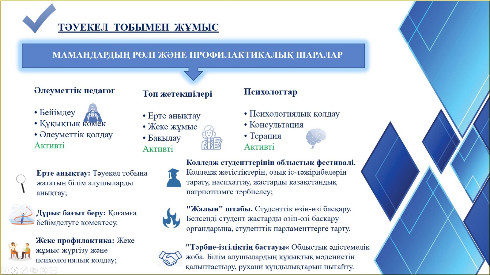- Заместитель директора по воспитательной работе Актюбинского колледжа сервиса, сертифицированный тренер А.Умирзакова подчеркнула стратегическую значимость превентивных мер, направленных на формирование правовой грамотности студентов как основы стабильного развития организации ТиПО.